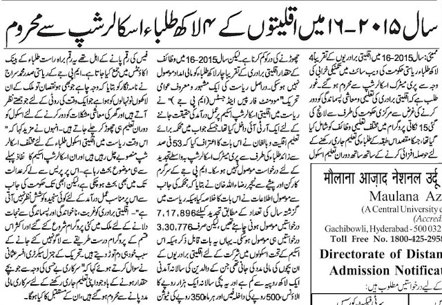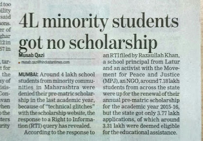 Mumbai— In the state of Maharashtra, about four lakh students belonging to the minority communities were denied Pre-Matric Scholarship in the last academic year due to the technical hiccups. This was admitted in an RTI reply to the Maharashtra’s Movement for Peace & justice, a well-known public movement of the state. Mr Razaullah Khan, a teacher by profession and a social activist associated with the Movement for Peace & Justice, filed an RTI application for knowing the ground reality of implementation of this much publicized minority welfare scheme, which aims to provide financial help in continuing the education and a measure to check the dropout rate among the weaker sections of the society. On 21st September, the Hindustan Times and the Indian Express published a detailed report on the issue.
