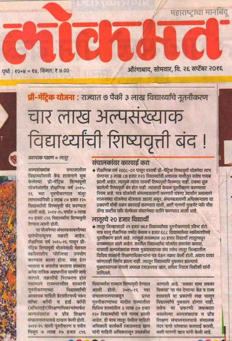 Mumbai— In the state of Maharashtra, about four lakh students belonging to the minority communities were denied Pre-Matric Scholarship in the last academic year due to the technical hiccups. This was admitted in an RTI reply to the Maharashtra’s Movement for Peace & justice, a well-known public movement of the state. Mr Razaullah Khan, a teacher by profession and a social activist associated with the Movement for Peace & Justice, filed an RTI application for knowing the ground reality of implementation of this much publicized minority welfare scheme, which aims to provide financial help in continuing the education and a measure to check the dropout rate among the weaker sections of the society. On 21st September, the Hindustan Times and the Indian Express published a detailed report on the issue.